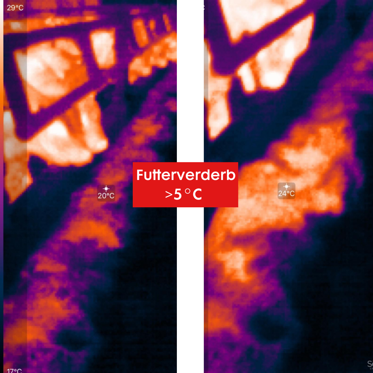 Abbildung 3. Infrarot‑Thermalbilder der äußeren Schicht (links) und des Kerns der TMR auf dem Futtertisch (rechts), die eine Temperaturdifferenz von 4 °C drei Stunden nach der TMR‑Zubereitung zeigen.