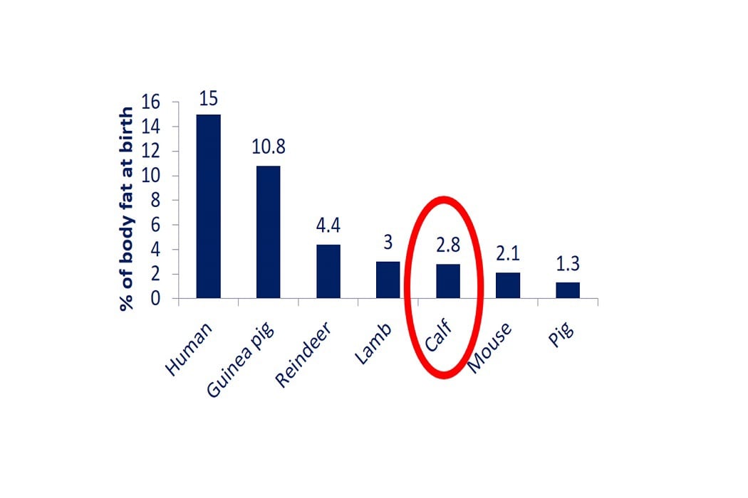 2) Im Vergleich zu anderen Säugetieren verfügen Kälber bei ihrer Geburt über niedrige Energiereserven (siehe Grafik). Daher wirkt sich die Fütterung das stark proteinreichen Kolostrums direkt nach der Geburt äußerst positiv auf die Tiere aus.